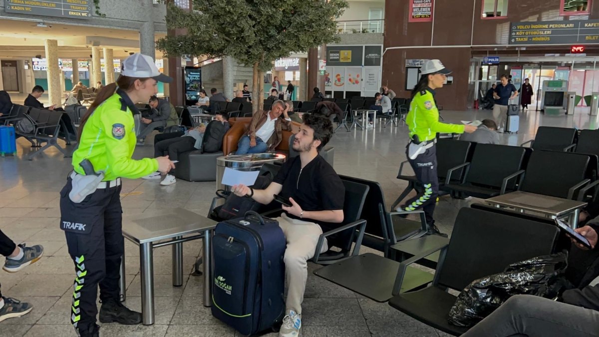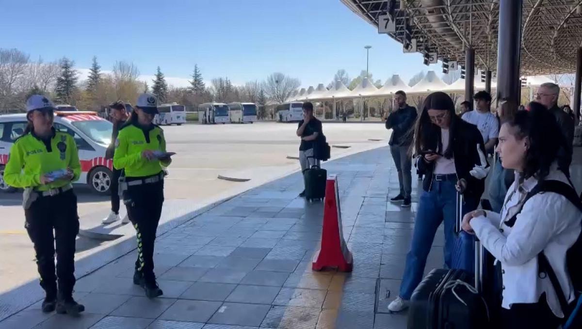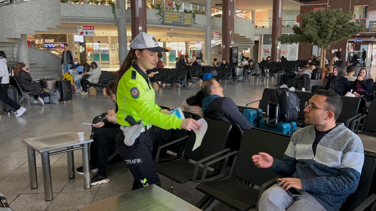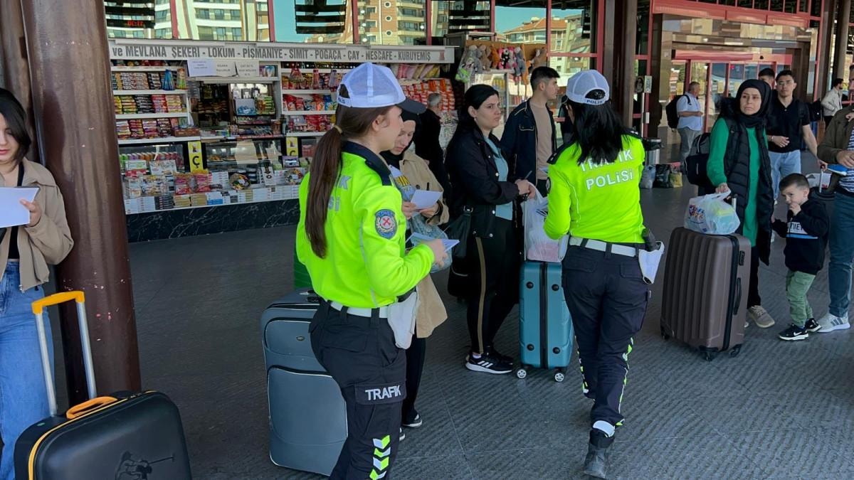 Konya Otogarı'nda bayram yoğunluğu nedeniyle yolculara trafik kuralları hakkında bilgilendirici broşürler dağıtıldı.