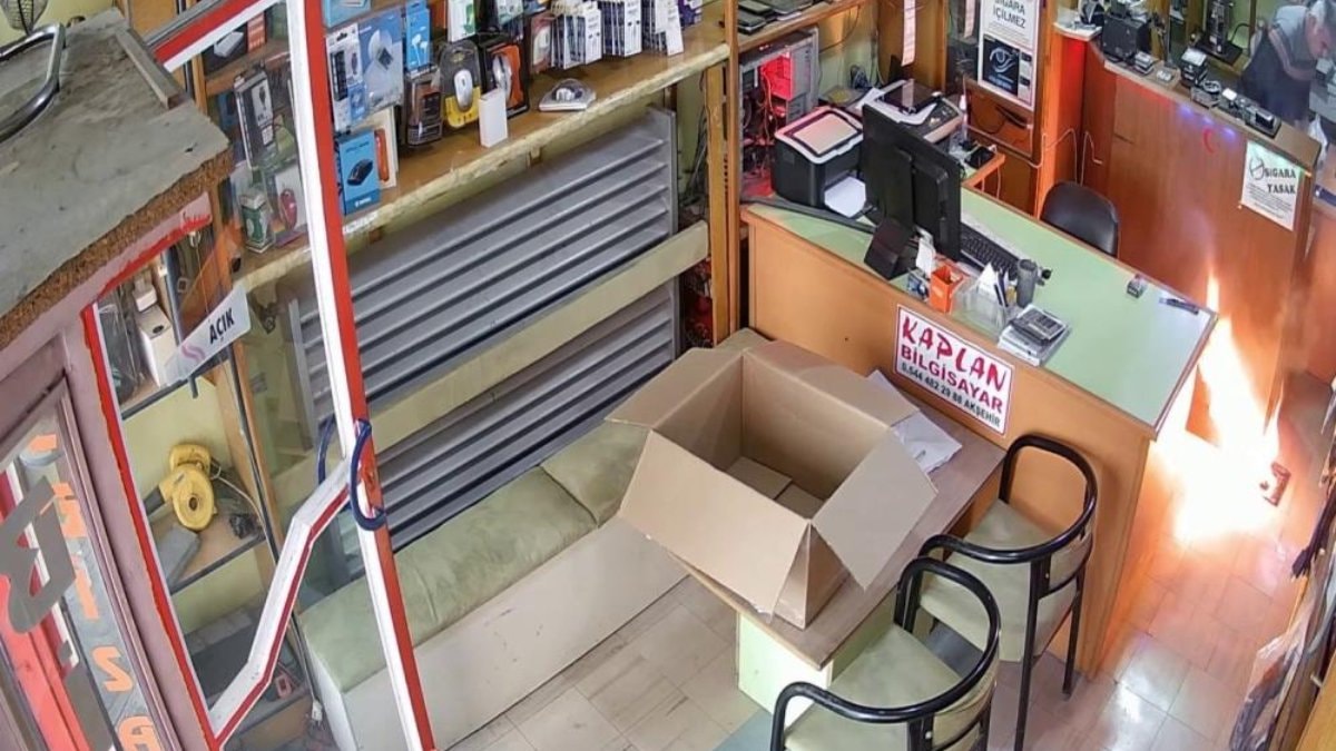 Tamir edilen tabletin bataryasının patlayarak alev topuna döndüğü ve servis sahibinin yaşadığı panik anları, iş yerinin güvenlik kamerasına saniye saniye yansıdı.