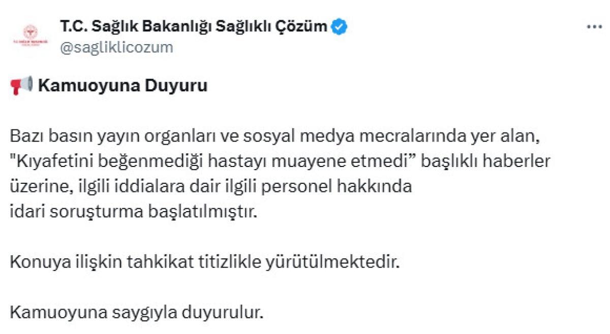 Bazı basın yayın organları ve sosyal medya mecralarında yer alan, "Kıyafetini beğenmediği hastayı muayene etmedi” başlıklı haberler üzerine, ilgili iddialara dair ilgili personel hakkında