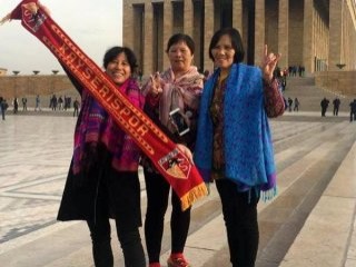 Güney Kore'den Türkiye'ye gezmeye gelen Koreliler, Anıtkabir ziyaretinde bulunan Kayserispor taraftarı arasına katılarak sarı kırmızılı atkı ile Ata'nın huzuruna çıktılar.
