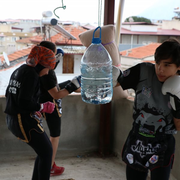 Koronavirüs sürecinde Muay Thai sporcusu Ömer Faruk, Şerife Naz ve Muhammet Öksüz kardeşler, evlerinin çatısında içi su dolu pet şişe ve yastıklarla antrenmanlarını sürdürüyorlar.
