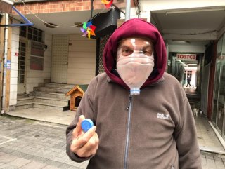 Maske bulamadığı için böyle ilginç bir çözüm ürettiğini ifade eden esnaf Ahmet Fahrettin Övünçkaya, “Böyle ilginç bir şey çok sağlıklı, ön kısmında olan deliklerden hava alıyor ve ses geçiriyor. Rahatça konuşabiliyor, gerektiğinde yemek yiyebiliyor, su da içebiliyorum. Boş su şişesini kestim, arka kısmını çıkarttım. Bunu herkes yapabilir. Baş kısmını lastik ile bağladım. İnsan zorda kalınca, yapamayacağı bir şey yok." dedi.