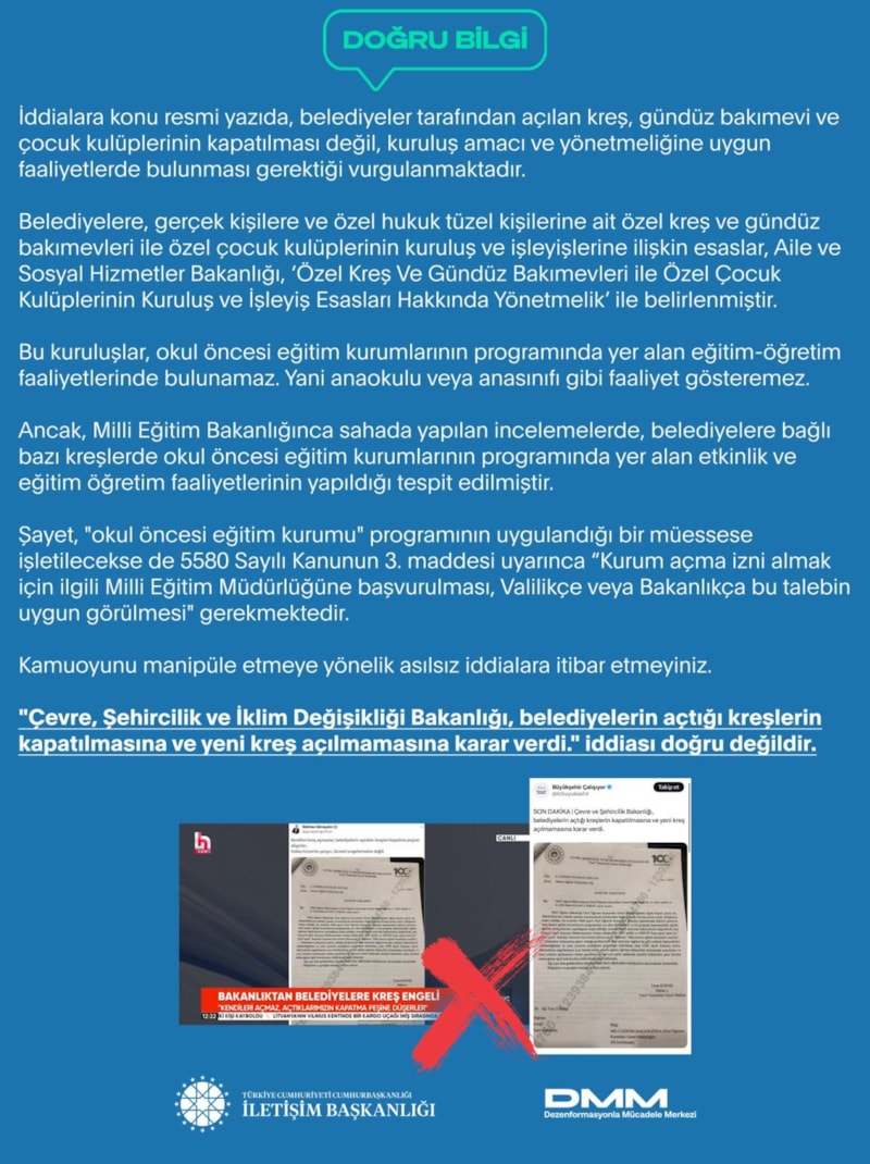 Dezenformasyonla Mücadele Merkezi, kısa sürede gündem olan "Çevre, Şehircilik ve İklim Değişikliği Bakanlığı, belediyelerin açtığı kreşlerin kapatılmasına ve yeni kreş açılmamasına karar verdi" şeklindeki iddiayı yalanladı.