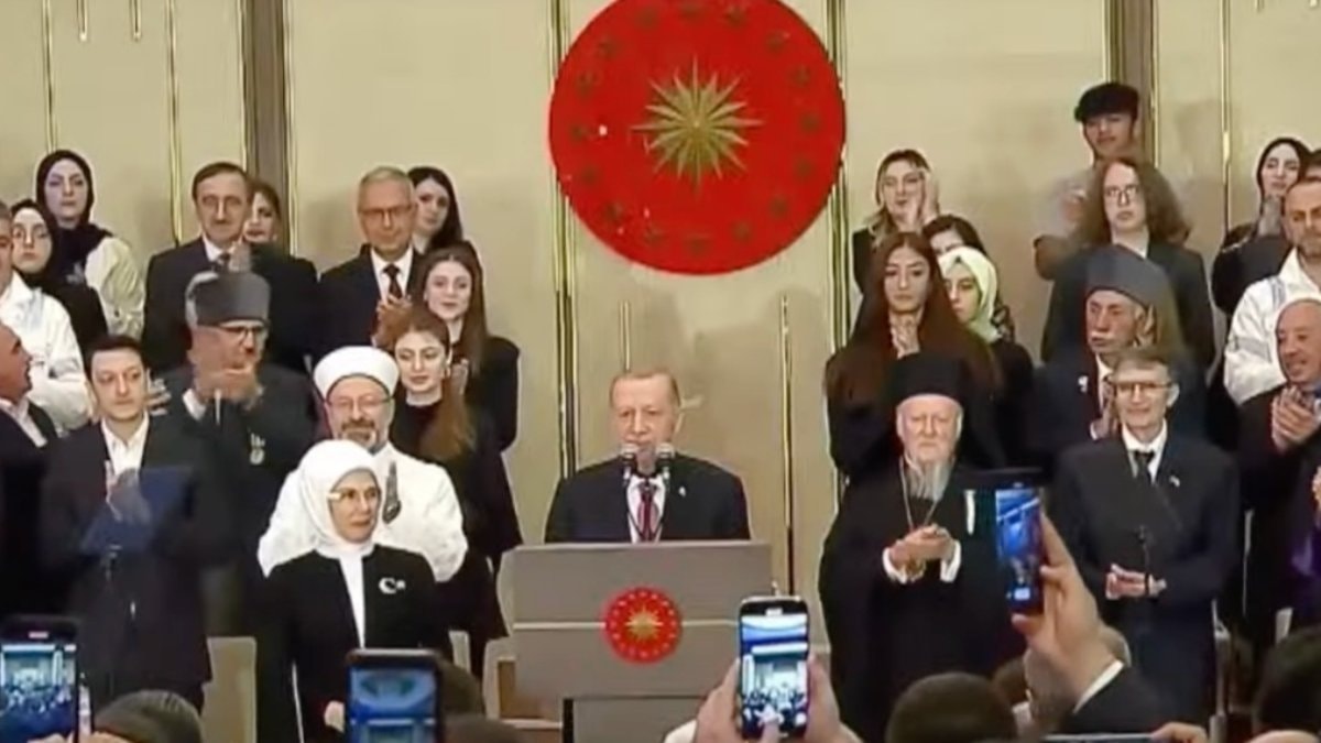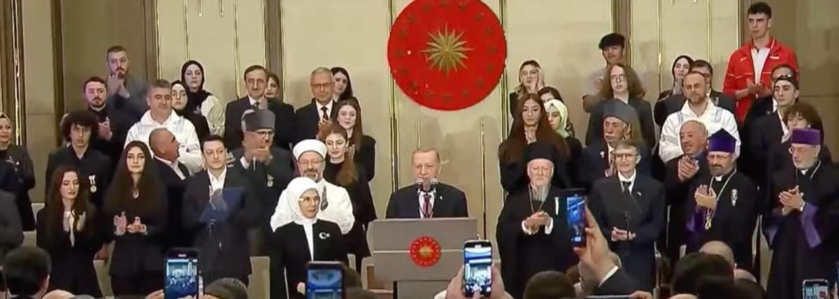 Cumhurbaşkanı Erdoğan'ın arkasında sporculardan Mesut Özil, Diyanet İşleri Başkanı Ali Erbaş yanında ise Ekümenik Patrik ve İstanbul Başpiskoposu I. Bartholomeos yer aldı.