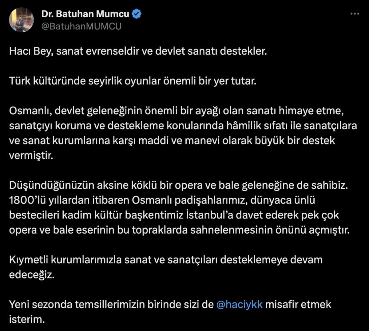 Mumcu, Yakışıklı'ya ithafen paylaştığı gönderisinde ülkemizin köklü bir opera ve bale geleneğine sahip olduğunun altını çizdi.