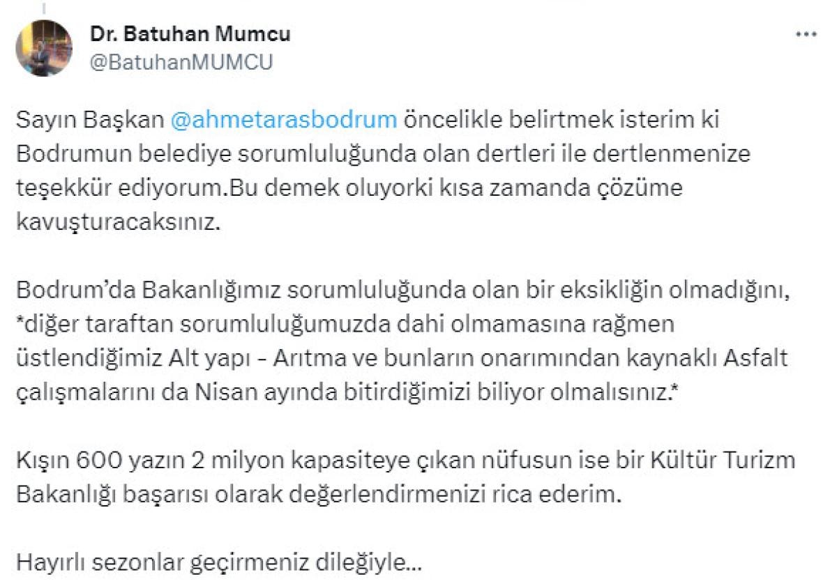 Ahmet Aras, "Merhaba. Temmuz ayında sona erecek olan altyapı projesi nedeniyle bozulan yollarımız, bulunduğu bölgeye Muğla Büyükşehir Belediyesi, Turizm Bakanlığı ve Karayolları sorumluluklarında. Çevreyi kirletenlere kesilecek ceza tutarı yasayla belirleniyor ve an itibarıyla bu tutarın hiçbir caydırıcılığı yok. İyi akşamlar." şeklinde yanıt verdi.