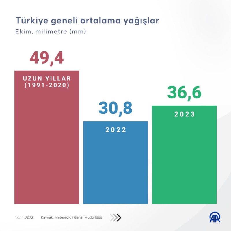 Yağış bakımından bakıldığında Türkiye geneli ekim ayı yağışları; normalinin altında, geçen yıl ekim ayı yağışlarının üzerinde gerçekleşti.
