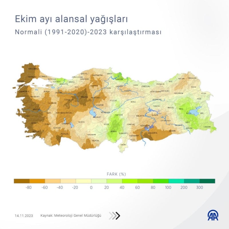 Ekim ayı yağışlarında Kocaeli, Sakarya, Samsun, Adana, Kayseri, Muş, Bitlis, Siirt, Şırnak ve Hakkari çevrelerinde yüzde 40-60 artma kaydedilirken, kıyı Ege, Marmara Bölgesi’nin batısı, Ankara, Eskişehir, Antalya ve Şanlıurfa çevrelerinde normallerine göre yüzde 80’in üzerinde azalma kaydedildi.