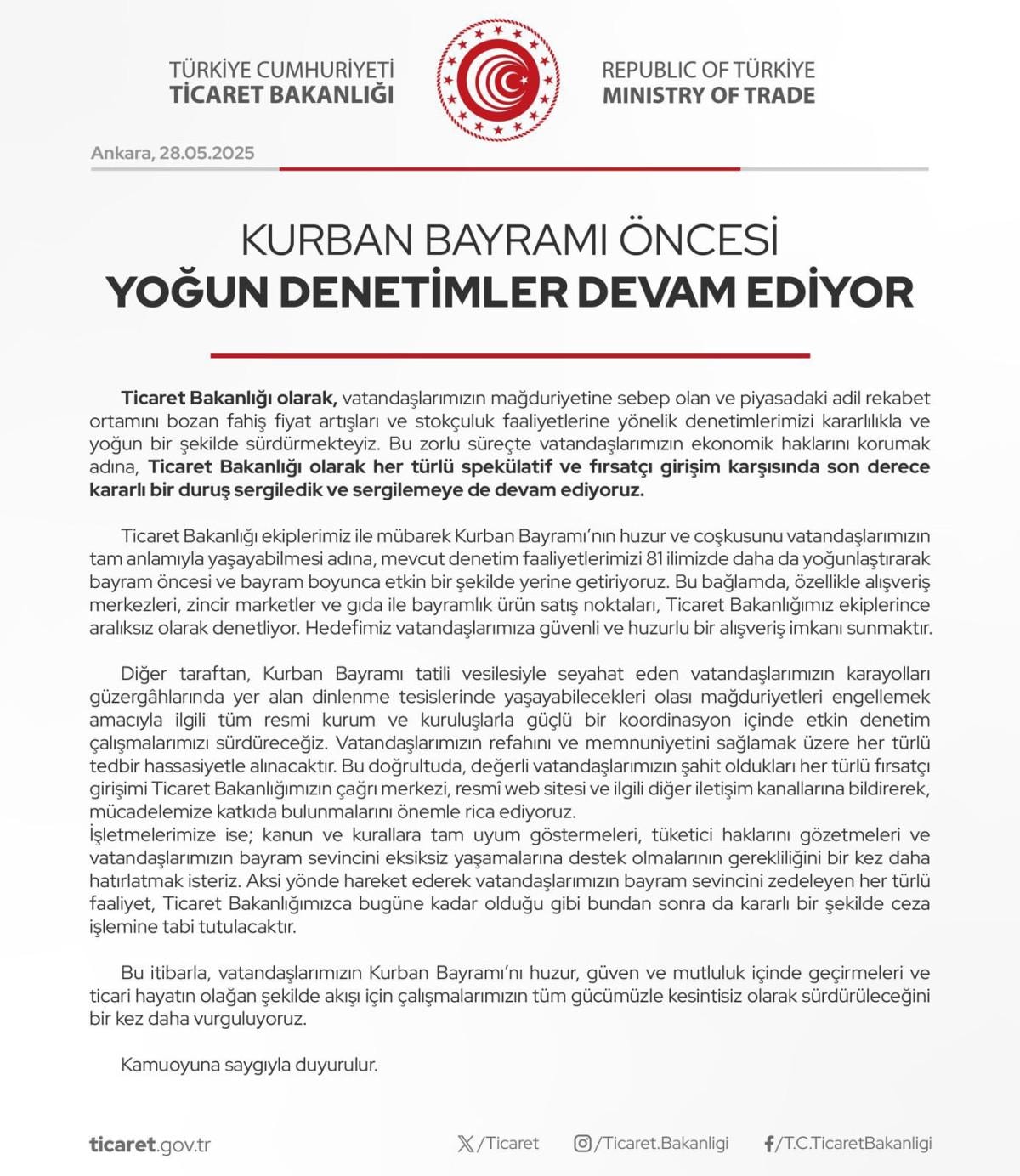 Bakanlıktan yapılan açıklamada, “Her türlü spekülatif ve fırsatçı girişime karşı son derece kararlı bir duruş sergilemeye devam ediyoruz” denilerek, bayram boyunca tüketicilerin ekonomik haklarının korunacağı vurgulandı.