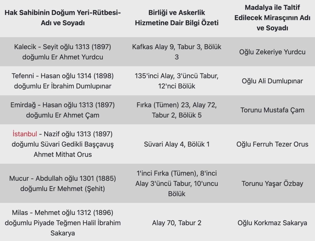 Karar İstiklal Madalyası Kanununun ek 4’üncü ve ek 6’ıncı maddeleri gereğince alınırken İstiklal Madalyası verilecek şehit ve gaziler ile mirasçılarının isimleri şöyle: