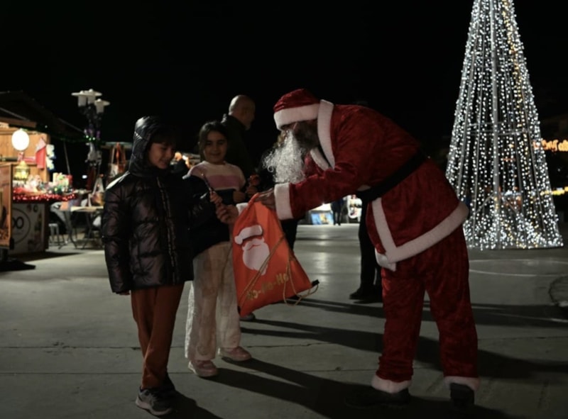 Işıklarla süslenen kamyonlardan inen Noel Baba kostümlü belediye personeli, çocuklara ve yetişkinlere şeker ikram etti.