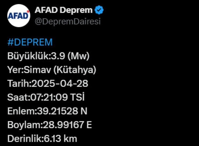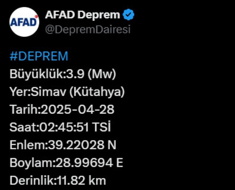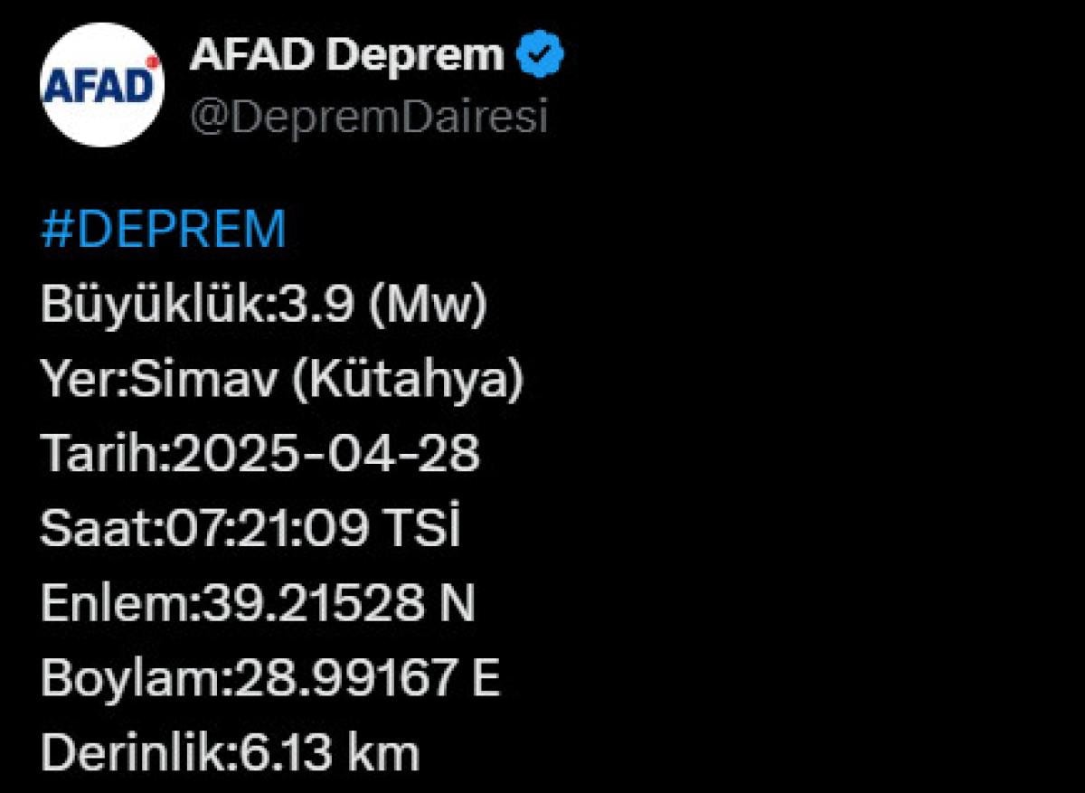 Afet ve Acil Durum Yönetimi Başkanlığı'nın internet sitesinden yaptığı açıklamaya göre saat 02.45'te merkez üssü Simav ilçesi olan 3.9 büyüklüğünde deprem kaydedildi.