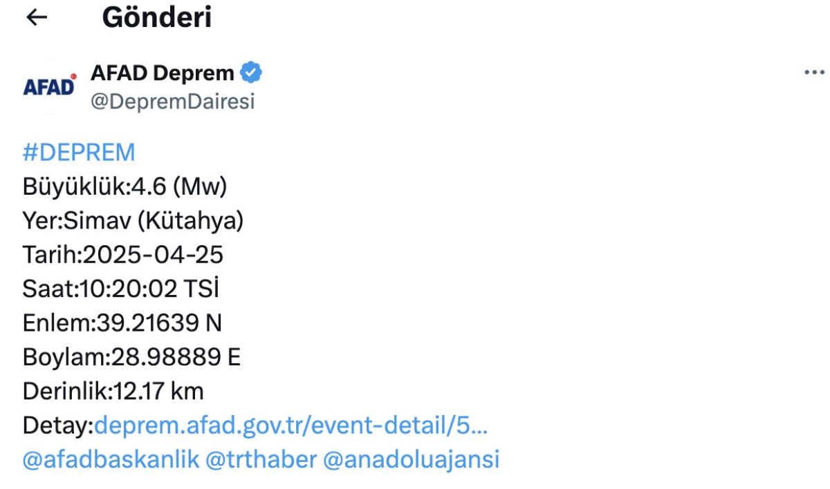 AFAD'dan alınan bilgiye göre saat 10:20'de ise 4.6 büyüklüğünde deprem meydana geldi.