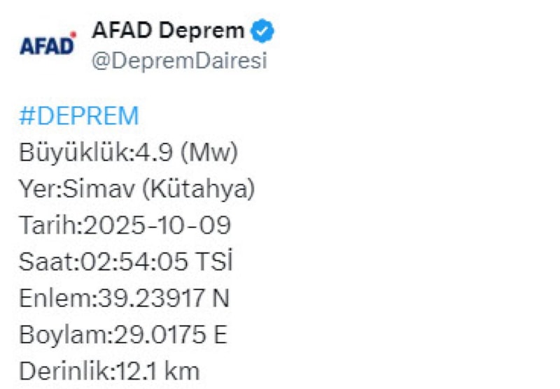 Afet ve Acil Durum Yönetimi Başkanlığı'nın internet sitesinde yer alan bilgiye göre saat 02.54'te merkez üssü Simav ilçesi olan 4.9 büyüklüğünde sarsıntı kaydedildi.
