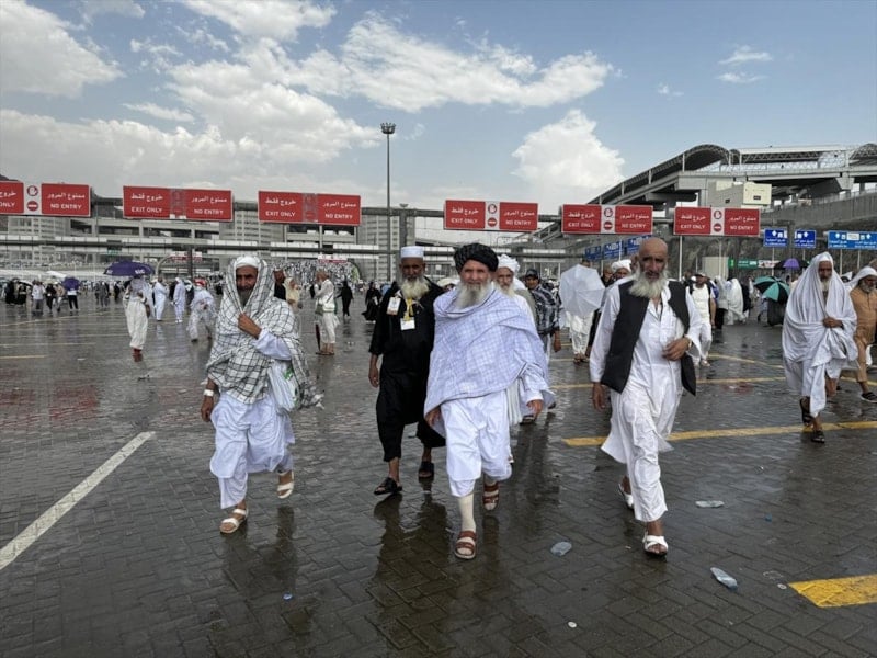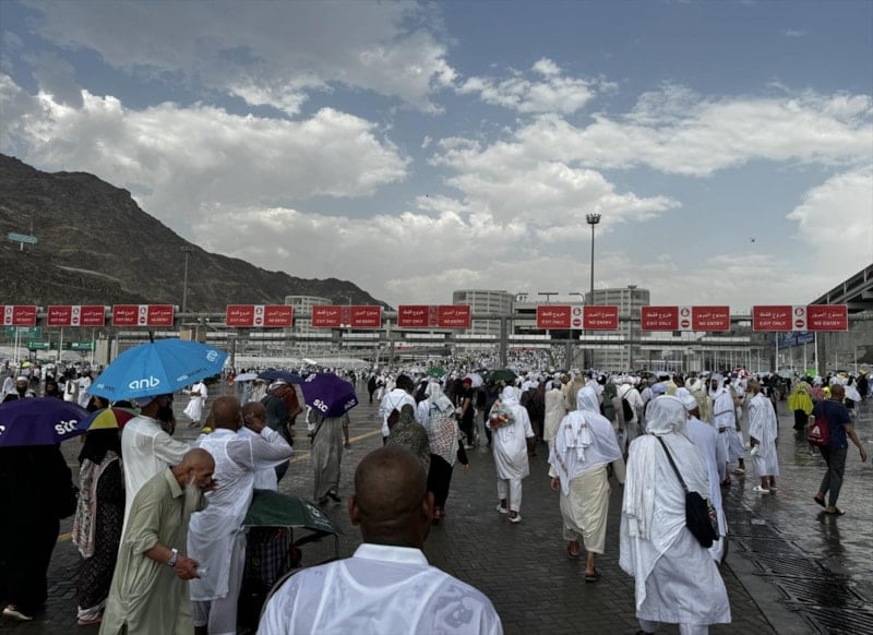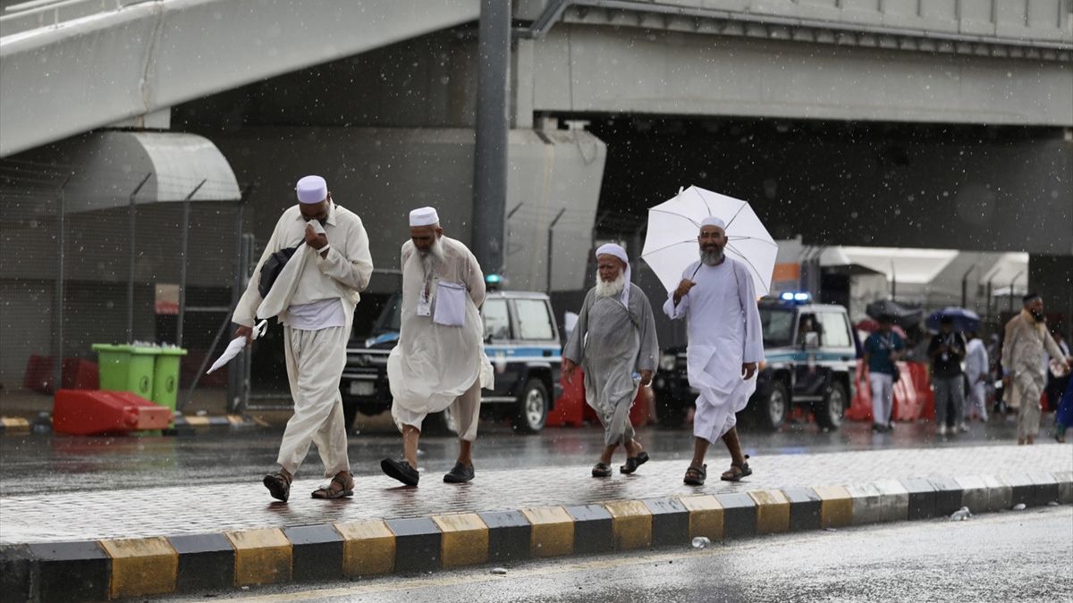Cemerat'taki şeytan taşlama alanına giden hacılar, ikindi vakti başlayan kısa süreli yağışa hazırlıksız yakalandı.