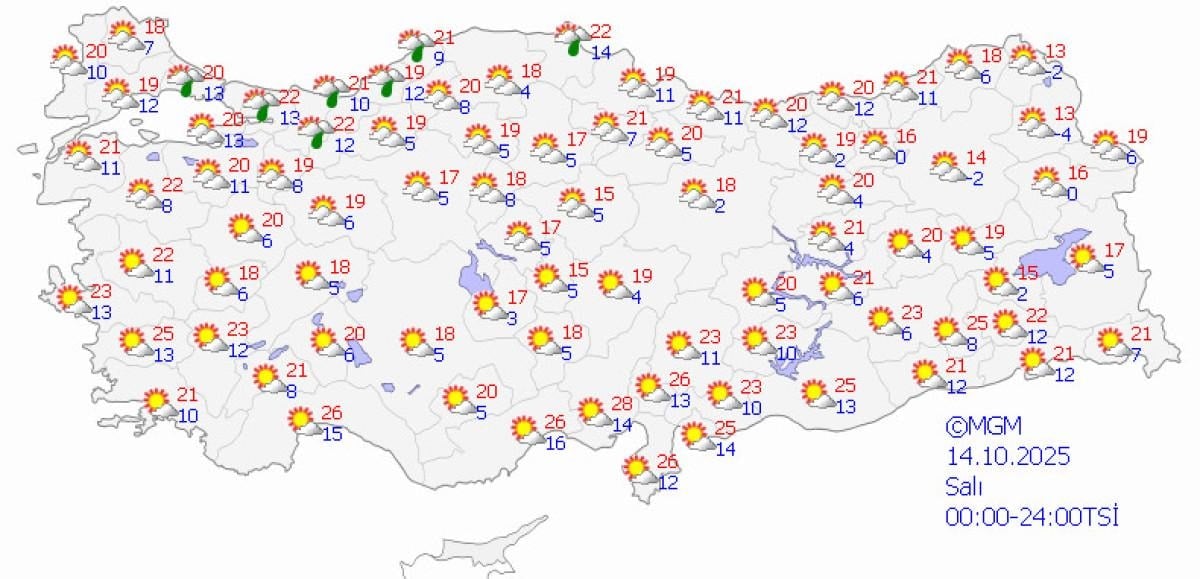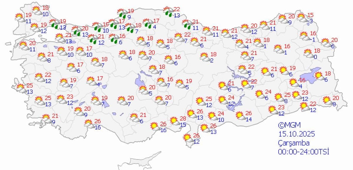 Yapılan tahminlere göre, yurdun kuzey, iç ve batı kesimleri parçalı ve çok bulutlu, Marmara (Çanakkale hariç), İç Anadolu'nun kuzeybatısı, Batı ve Orta Karadeniz, Doğu Karadeniz kıyıları ile Kütahya, Uşak, Afyonkarahisar, Konya, Aksaray, Kırşehir, Yozgat ve Artvin çevreleri yağmur ve sağanak yağışlı, yer yer gök gürültülü sağanak yağışlı olacak.