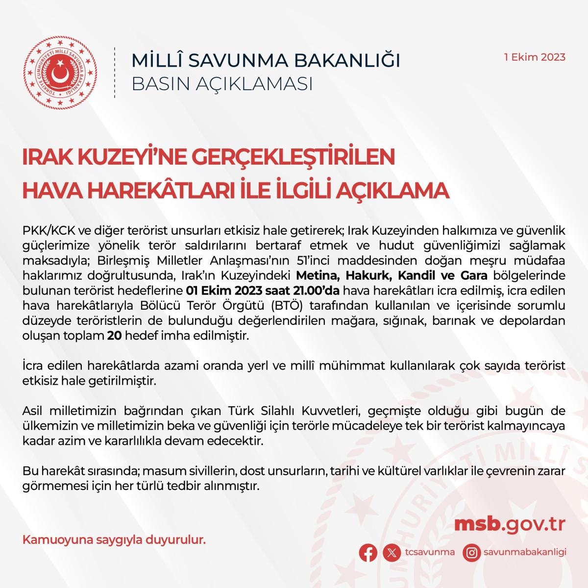 PKK/KCK ve diğer terörist unsurları etkisiz hale getirerek; Irak'ın Kuzeyinden halkımıza ve güvenlik güçlerimize yönelik terör saldırılarını bertaraf etmek ve hudut güvenliğimizi sağlamak maksadıyla; Birleşmiş Milletler Anlaşması'nın 51. maddesinden doğan meşru müdafaa haklarımız doğrultusunda, Irak’ın kuzeyindeki Metina, Hakurk, Kandil ve Gara bölgelerinde bulunan terörist hedeflerine 1 Ekim 2023 saat 21.00’de hava harekatları icra edilmiş, icra edilen hava harekatlarıyla bölücü terör örgütü tarafından kullanılan ve içerisinde sorumlu düzeyde teröristlerin de bulunduğu değerlendirilen mağara, sığınak, barınak ve depolardan oluşan toplam 20 hedef imha edilmiştir.