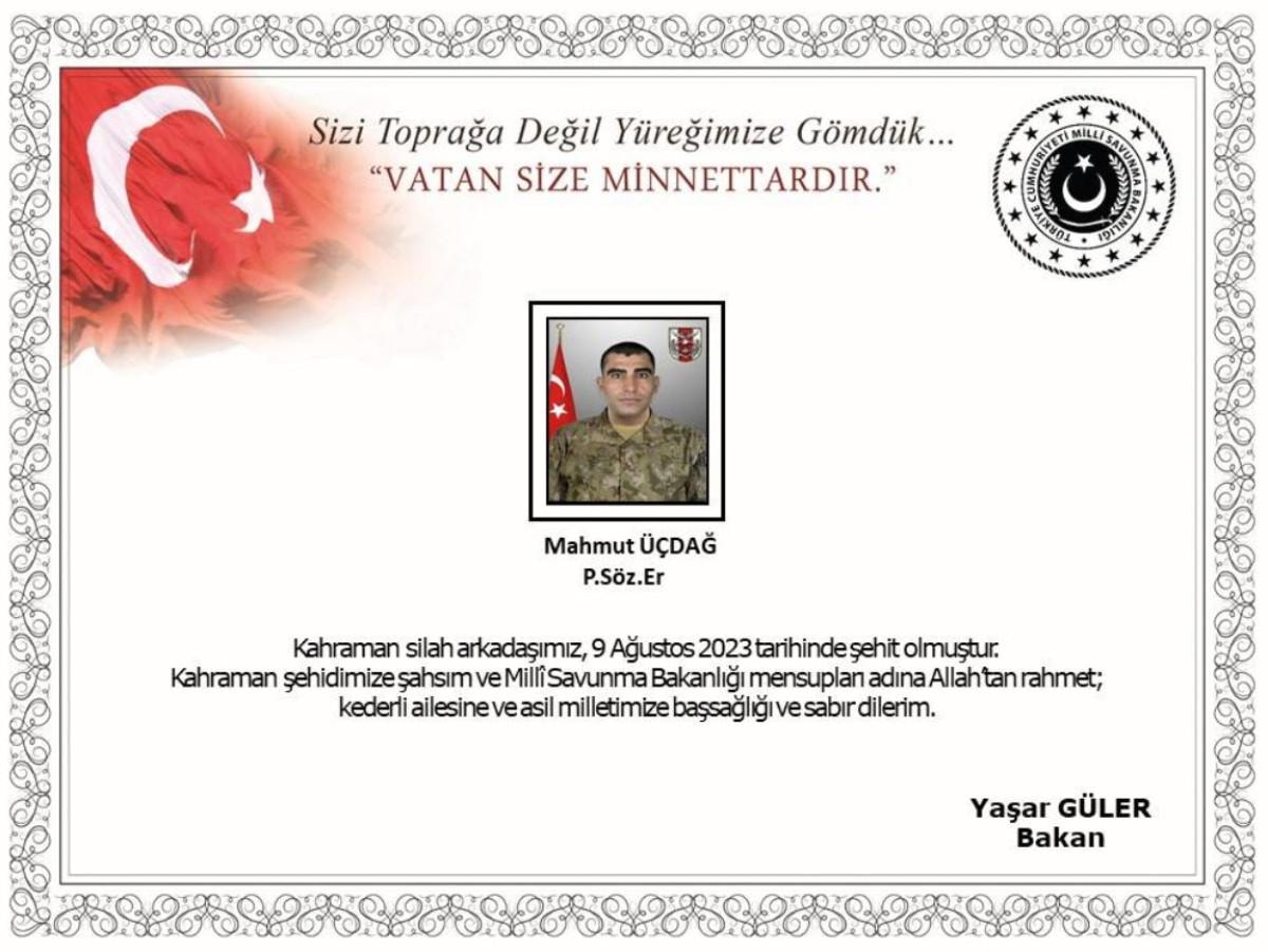 MSB tarafından yapılan açıklamada, “Pençe-Kilit operasyonu bölgesinde BTÖ mensupları tarafından açılan taciz ateşi sonrasında yaralanan ve hastanede tedavisine devam edilen kahraman silah arkadaşlarımızdan Piyade Sözleşmeli Er Mahmut Üçdağ, yapılan tüm müdahalelere rağmen kurtarılamayarak şehit olmuştur. Bölgede operasyonlar devam etmektedir. Bizleri derin bir acı ve üzüntüye boğan bu olayda, hayatını kaybeden aziz şehidimize Allah’tan rahmet, kederli ailesine, Türk Silahlı Kuvvetleri ile asil milletimize başsağlığı ve sabır, yaralanan ve tedavisi devam eden kahraman silah arkadaşlarımıza da acil şifalar dileriz” ifadeleri kullanıldı.