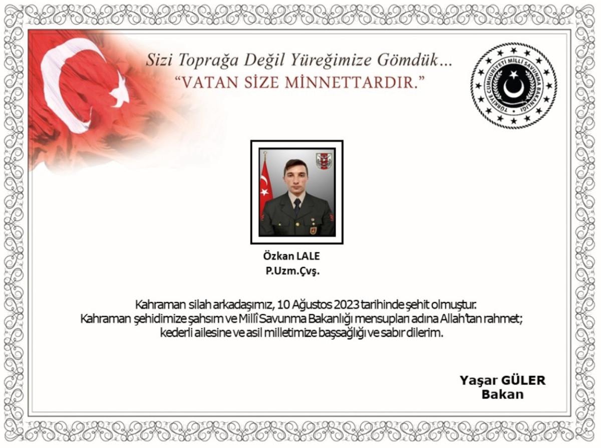 Yaralanan ve hastanede tedavisine devam edilen askerlerden Piyade Uzman Çavuş Özkan Lale de müdahaleye rağmen kurtarılamadı.