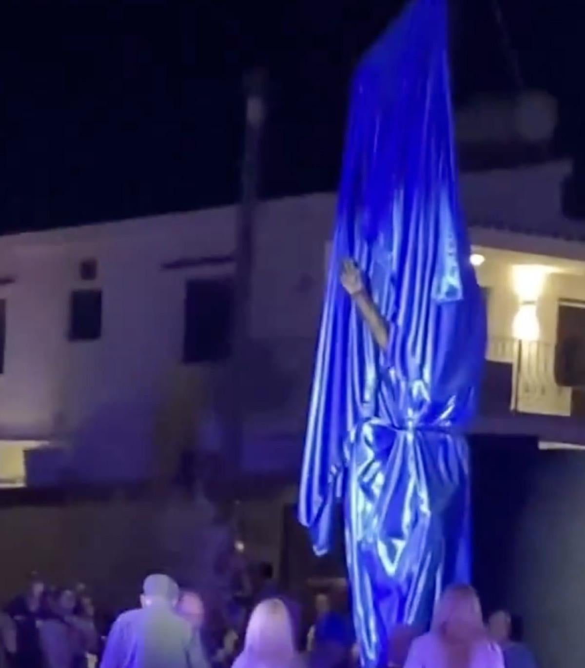 Videoda, mavi bir beze sarılı heykelin alkışlar içerisinde açıldığı ve ardından da bir direğe sarılı olan Solomos Solomou’nun heykelinin görüldüğü anlar yer aldı.