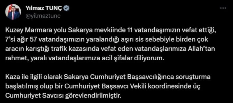 Kuzey Marmara Otoyolu'nda gerçekleşen kazaya ilişkin soruşturma başlatıldığını açıklayan Adalet Bakanı Yılmaz Tunç, "Cumhuriyet Başsavcı Vekili koordinesinde üç Cumhuriyet Savcısı görevlendirilmiştir" dedi.