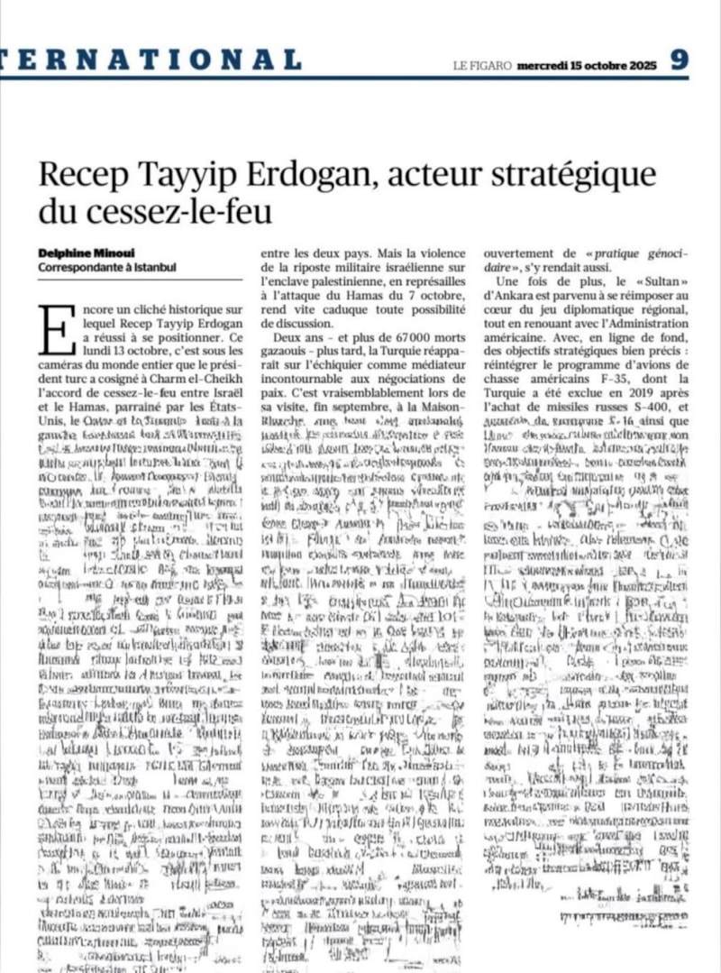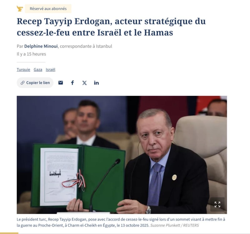 Bu kapsamda Fransız Le Figaro gazetesi, "İsrail ile Hamas arasındaki ateşkesin stratejik aktörü Recep Tayyip Erdoğan" başlıklı bir makale yayınlayarak Türkiye ve Erdoğan'ın barıştaki rolünü anlattı.