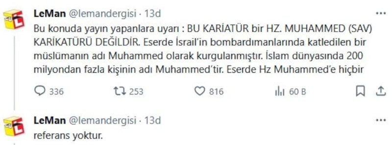 Leman dergisinin son sayısında yayımlanan karikatür, İslam dinine ve Hz. Muhammed’e yönelik saygısızlığı nedeniyle kamuoyunda büyük tepki topladı. Tepkiler üzerine Adalet Bakanlığı dergi hakkında soruşturma başlattı.
