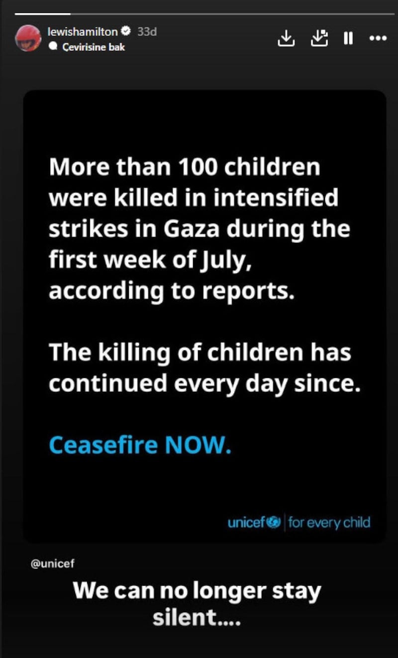 Sosyal medya hesabından bir paylaşım yapan Hamilton, “Haberlere göre Gazze’ye yönelik saldırılar sonucu Temmuz ayının ilk haftasında 100’den fazla çocuk öldürüldü. Bu her gün devam ediyor. Artık sessiz kalamayız." ifadelerini kullandı.