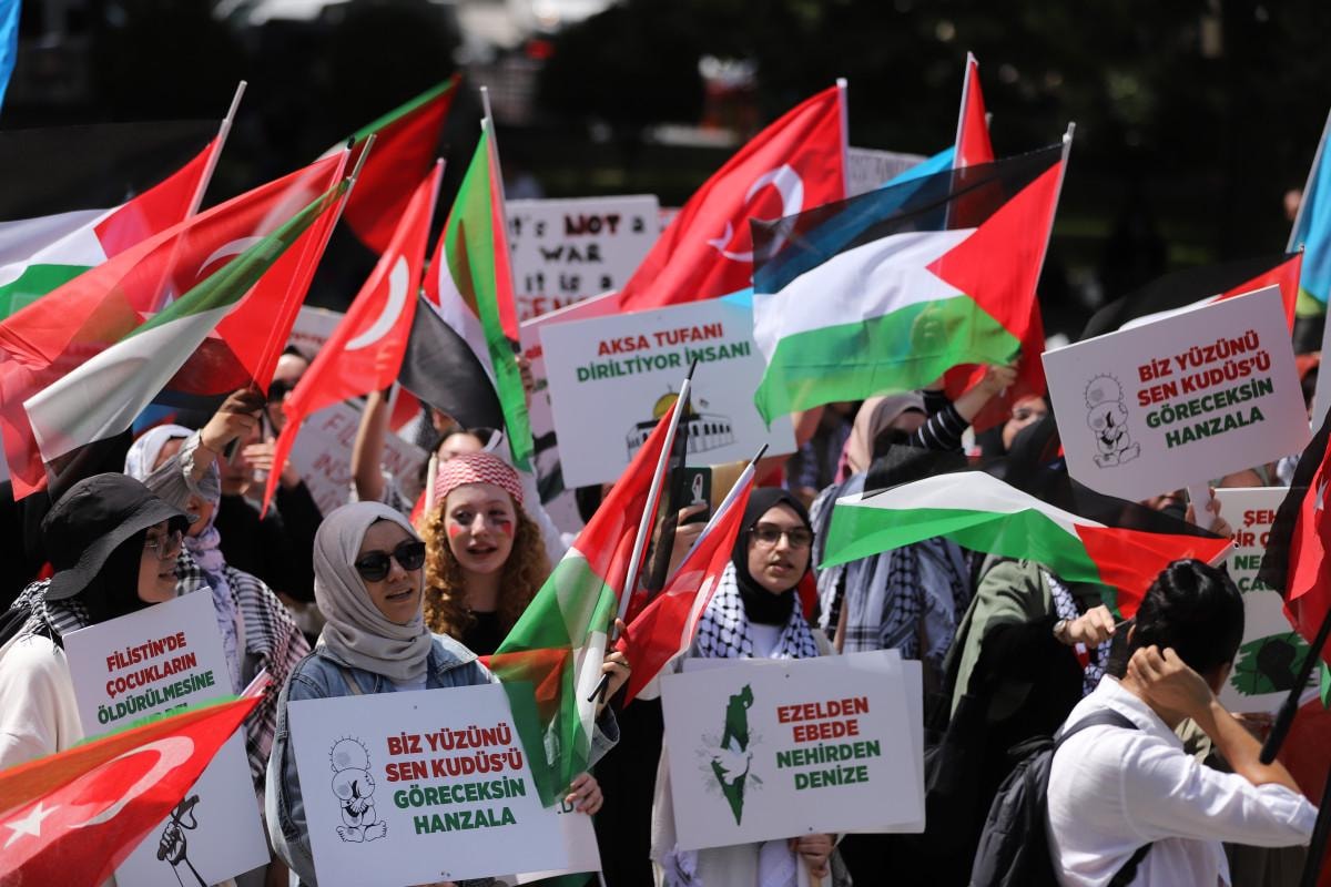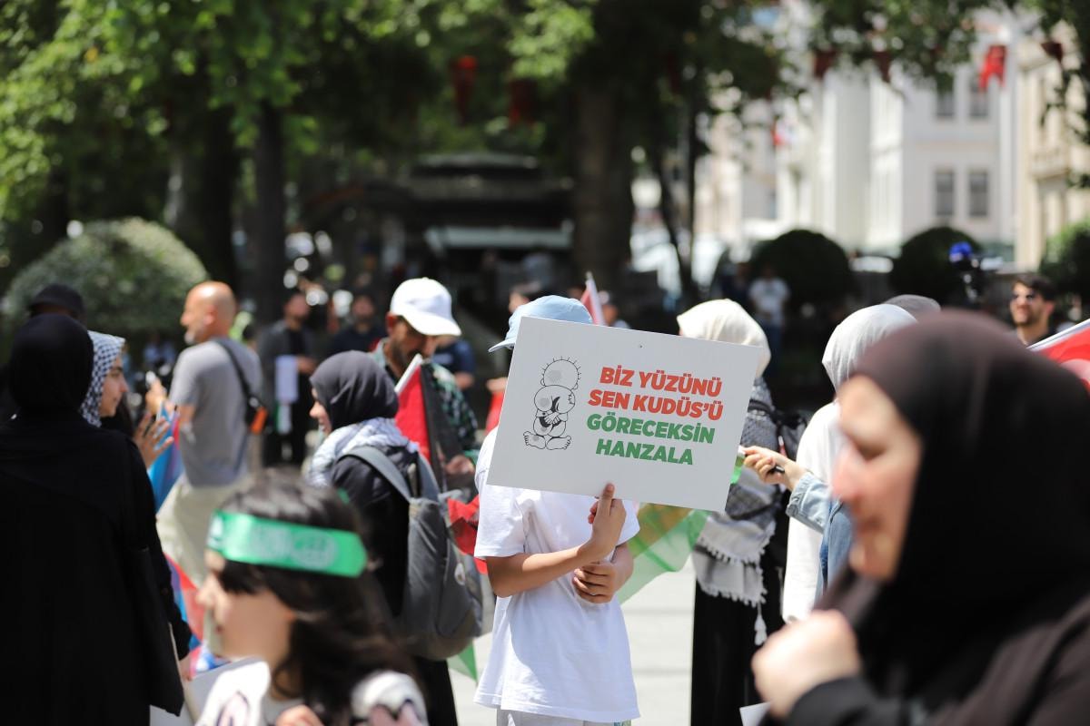 Saraçhane’de yapılan eylemde Türkçe, İngilizce, Arapça, Rusça, İspanyolca ve Fransızca olmak üzere 6 dilde basın açıklaması yaparak “Filistin’de zulmü durdurun” dediler ve tüm dünya liderlerine seslendiler.