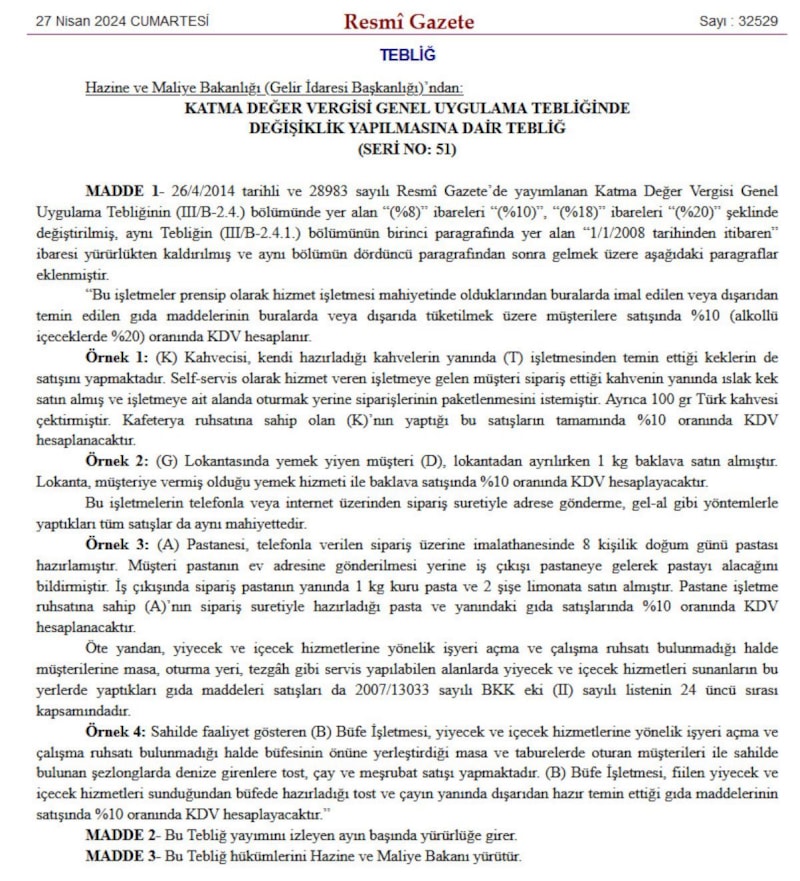 Türkiye genelinde lokanta ve kafeleri yakından ilgilendiren, Hazine ve Maliye Bakanlığı'nın Katma Değer Vergisi Genel Uygulama Tebliğinde Değişiklik Yapılmasına Dair Tebliği, Resmi Gazete'de yayınlandı.