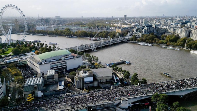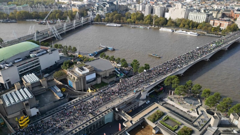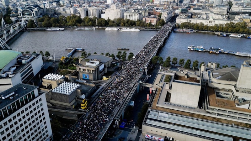 "Adalet yoksa barış da yok", "Gazze'de soykırım var", "İşgale son", "Şimdi ateşkes" yazılı pankartlar taşıyarak, "Filistin'e özgürlük" sloganları atan göstericiler, daha sonra İngiltere Parlamentosu önündeki Westminster Köprüsü'nden geçerek nehrin güneyine indi.