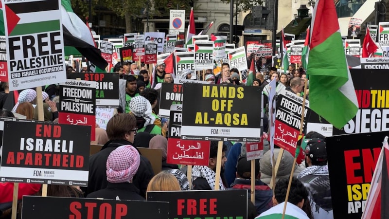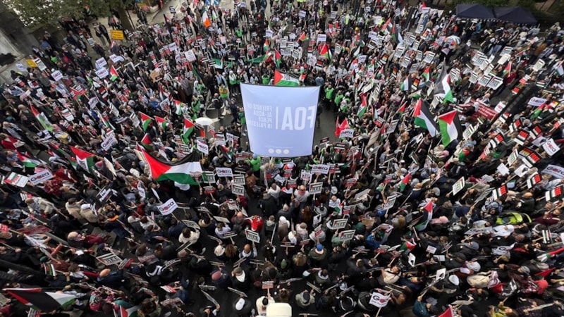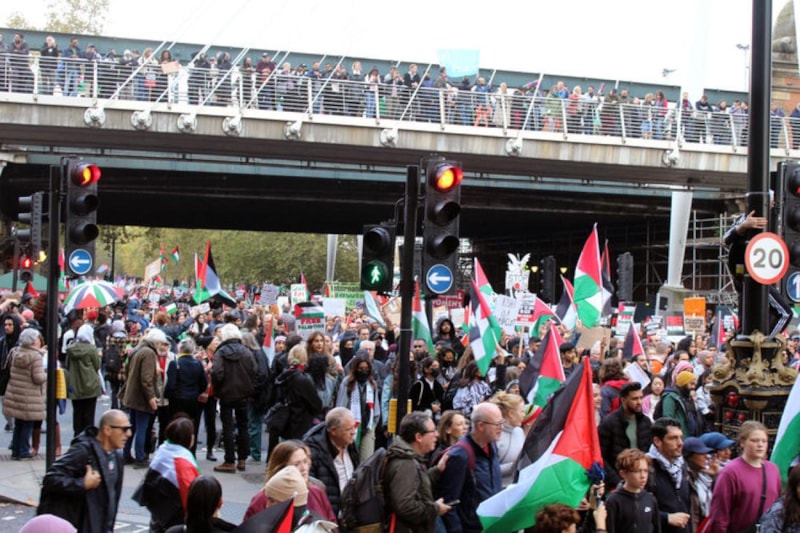 İngiltere'nin başkenti Londra'da Filistin'le dayanışma gösterisi için toplanan on binlerce kişi, polisin yoğun güvenlik önlemleri altında üçüncü kez yürüdü.