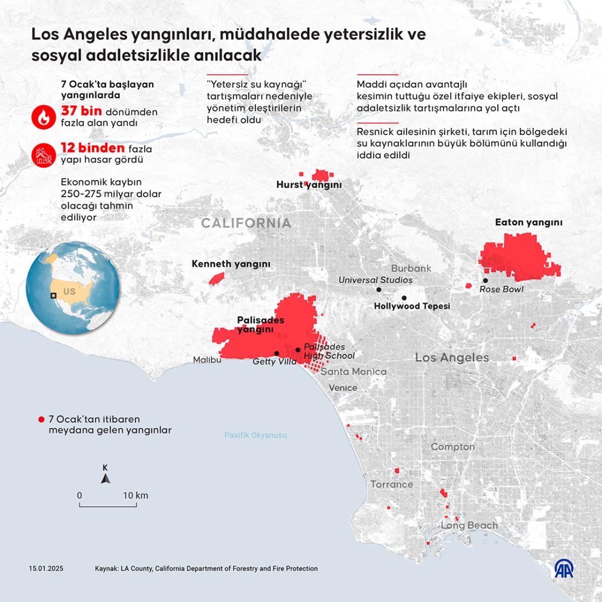 ABD'nin California eyaletinin Los Angeles kentinde 7 Ocak'ta sabah saatlerinde Pacific Palisades bölgesinde başlayan ve Eaton, Hurst, Sunset, Woodley bölgeleri başta olmak üzere, hızla çevreye yayılan orman yangınlarında, bugüne kadar 25 kişi hayatını kaybetti, 37 bin dönümden fazla alan kül oldu. Yangınların neden olduğu toplam hasar ve ekonomik kaybın 250 ila 275 milyar dolar olacağı tahmin ediliyor.