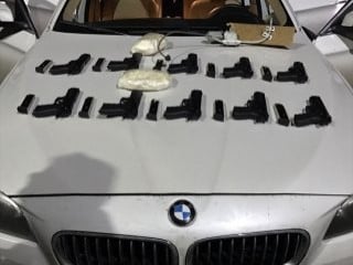 Azerbaycan uyruklu sürücü E.K. ve kız arkadaşı olduğu öğrenilen T.Ö'nün tedirgin hareketleri üzerine polis, araçta arama yaptı. Lüks otomobilin kolçak kısmı ile arama sırasında tespit edilen ve arka kapıdaki cam motoruna bağlı düzenekle açılan gizli bölmede, 11 Sig Sauer marka tabanca, 12 şarjör ve bunlara ait çok sayıda mermi ile 1 kilo 160 gram kokain ele geçirildi.