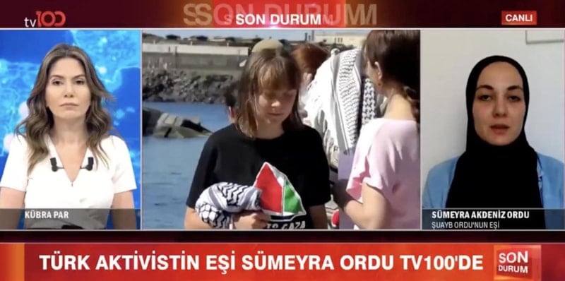 İsrail'in uluslararası sularda müdahale edip alıkoyduğu Madleen isimli yelkenlide bulunan Türk aktivist Şuayb Ordu’nun eşi, tv100'de Kübra Par'la Ana Haber'de önemli açıklamalarda bulundu.