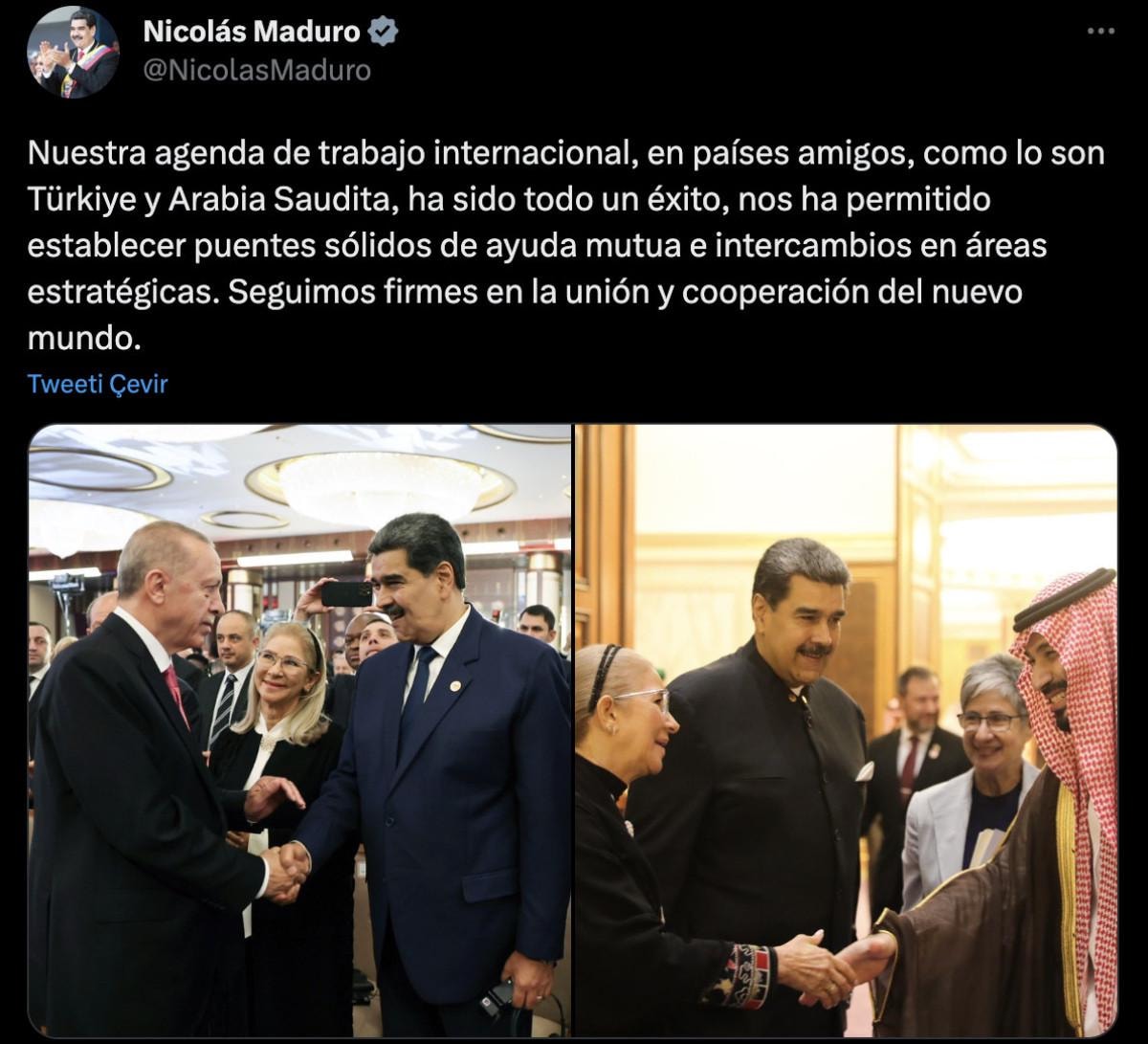 Törenin ardından Suudi Arabistan'a geçerek Suudi Arabistan Veliaht Prens Muhammed bin Selman ile bir araya gelen Maduro, resmi sosyal medya hesabı üzerinden Türkiye vurgulu bir paylaşımda bulundu.