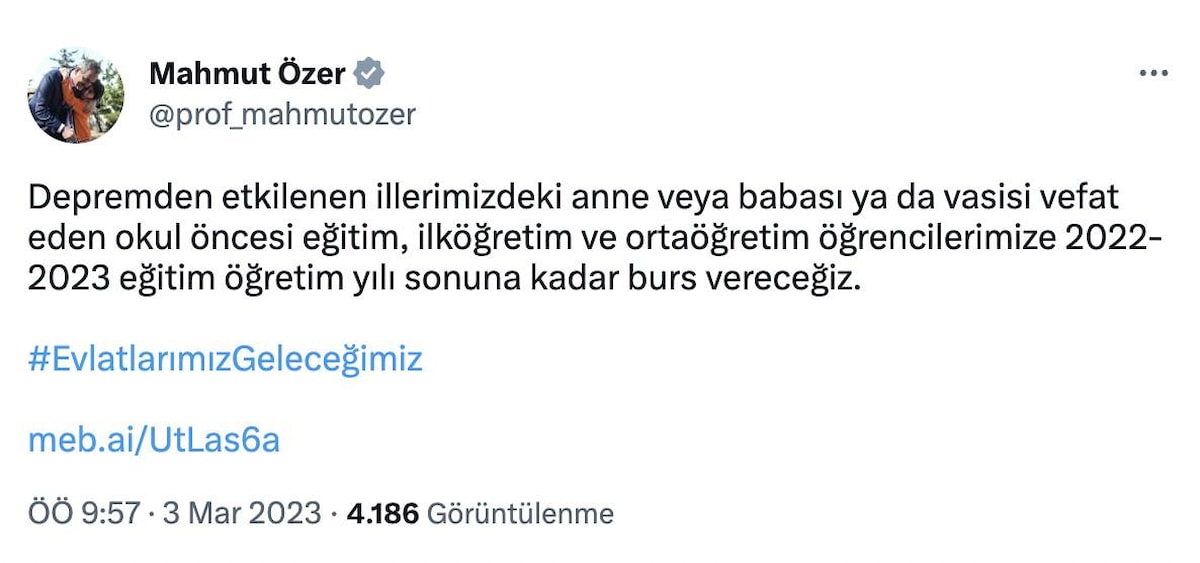 Özer sosyal medya üzerinden yaptığı açıklamada, depremlerde ailesini kaybeden öğrencilere yıl sonuna kadar burs verileceğini ifade etti.