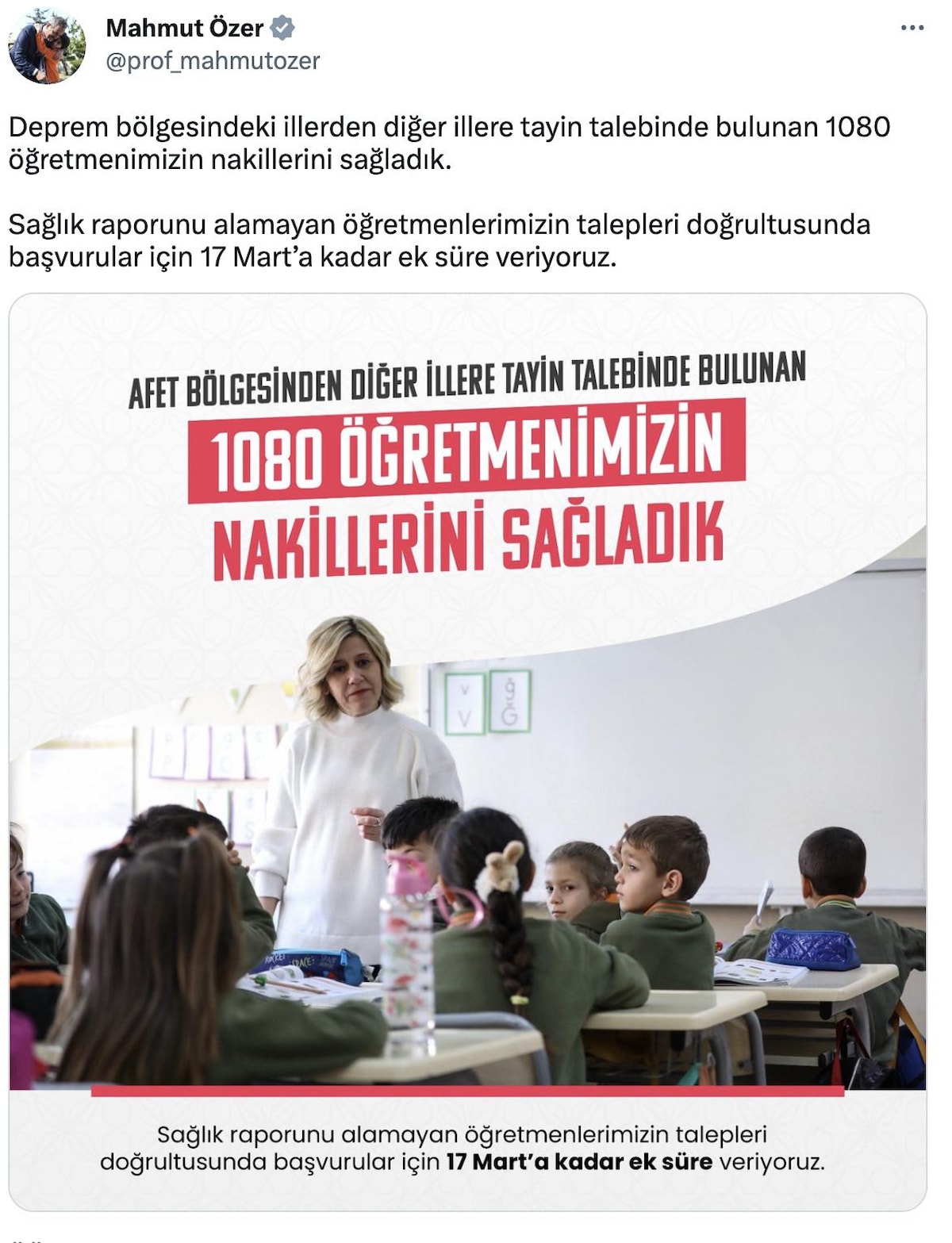 Deprem bölgesindeki illerden diğer illere tayin talebinde bulunan 1080 öğretmenimizin nakillerini sağladık. Sağlık raporunu alamayan öğretmenlerimizin talepleri doğrultusunda başvurular için 17 Mart’a kadar ek süre veriyoruz.