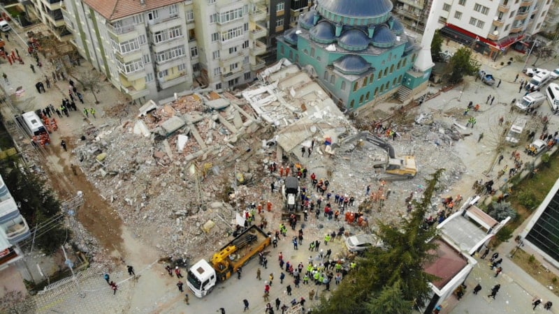 Çöken binada ekiplerin arama kurtarma çalışmaları drone ile görüntülendi.