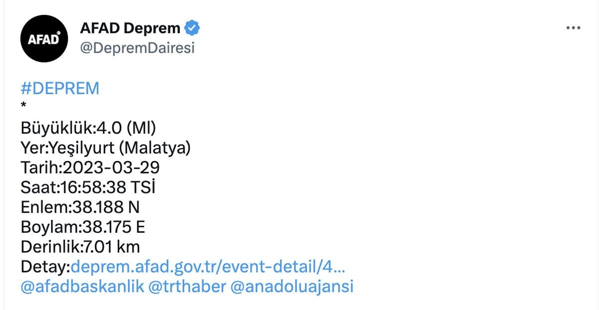 AFAD, depremin merkez üssü olarak Yeşilyurt ilçesini işaret etti.