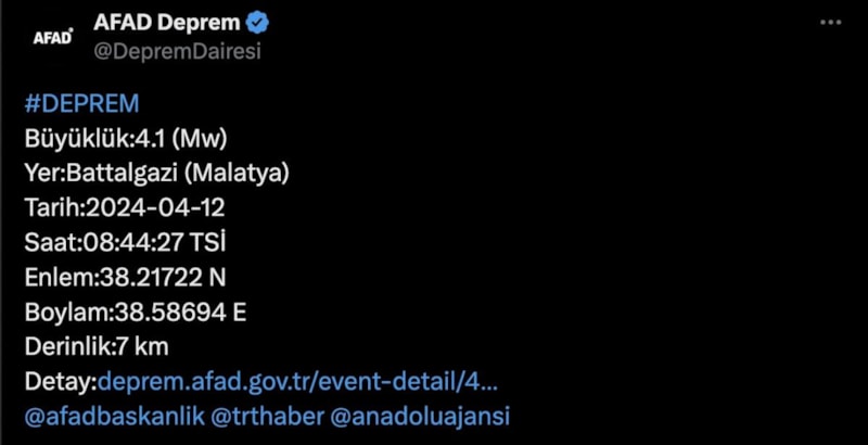 AFAD, merkez üssü Malatya'nın Battalgazi ilçesi olan 4.1 büyüklüğünde deprem meydana geldiğini açıkladı.