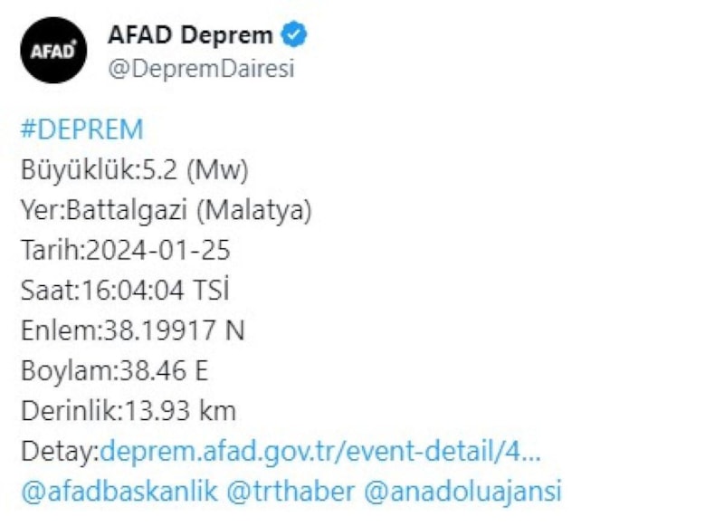 AFAD, depremin merkez üssü olarak Battalgazi ilçesini işaret etti.
