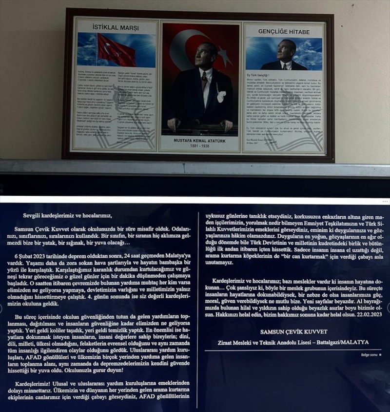 Samsun Çevik Kuvvet olarak okulunuzda bir süre misafir olduk. Odalarınızı, sınıflarınızı, sıralarınızı kullandık. Bir sınıfın, bir sıranın hiç aklımıza gelmezdi bize bir yatak, bir sığınak, bir yuva olacağı. 6 Şubat 2023 tarihinde deprem olduktan sonra, 24 saat geçmeden Malatya'ya vardık. Yaşamı daha da zora sokan hava şartlarıyla ve hayatın bambaşka bir yüzü ile karşılaştık. Karşılaştığımız karanlık durumdan kurtulacağımız ve güneşi tekrar göreceğimiz o güzel günler için bir dakika düşünmeden çalışmaya başladık. O saatten itibaren çevremizde bulunan yardıma muhtaç her kim varsa elimizden ne geliyorsa yapmaya, devletimizin varlığını ve milletimizin yalnız olmadığını hissettirmeye çalıştık. Dördüncü günün sonunda ise siz değerli kardeşlerimizin okuluna geldik.