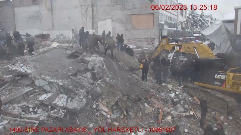 Arama kurtarma çalışmalarının yapıldığı sırada yaşanan depremde, enkaz üstünde bulunanların kaçışması görüntülere yansıdı.