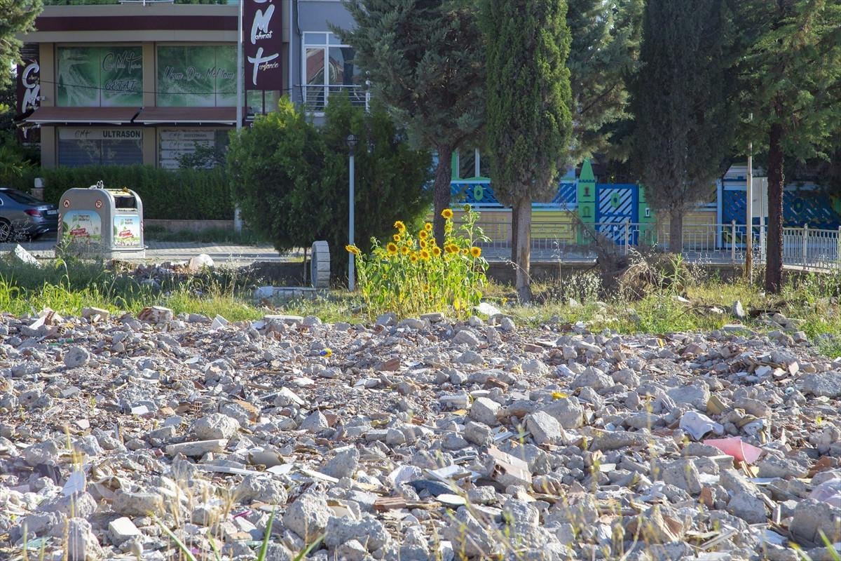 Sitedeki iki blokun yıkıldığını, diğer bloklarda ise hasar olmadığını belirten Yılmaz, "Yıkım olan yerlerde gördüğünüz gibi kendiliğinden ayçiçekleri açmış ve hayata tutunmuşlar." dedi.