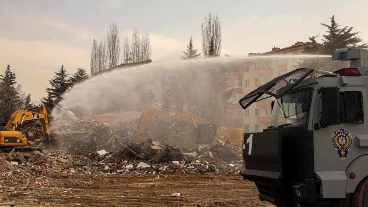 Enkaz kaldırma çalışmalarında polisin TOMA araçları toz kalkmaması için su sıkarken, molozlar ise kamyonlarla hafriyat alanına taşınıyor.