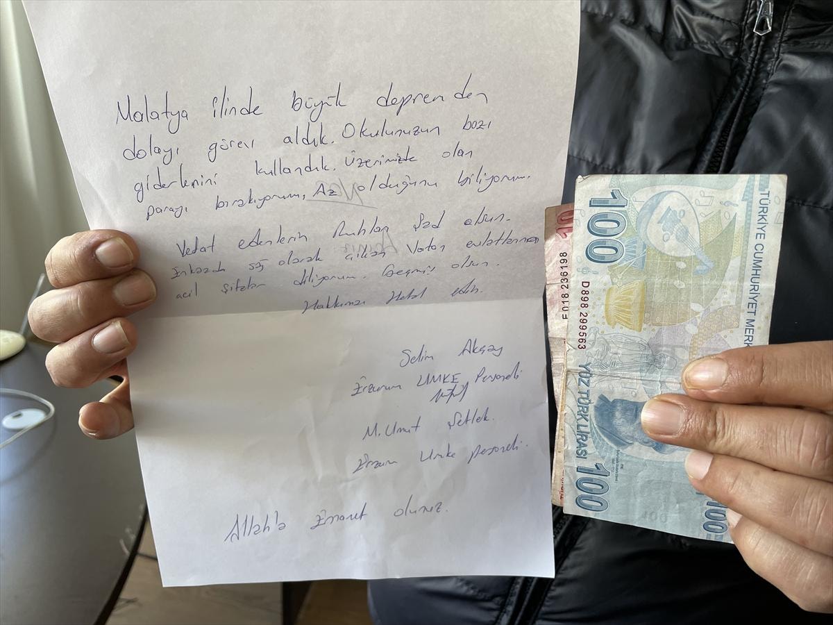 Notta, "Malatya ilinde büyük depremden dolayı görev aldık. Okulunuzun bazı giderlerini kullandık. Üzerimizde olan parayı bırakıyorum. Az olduğunu biliyorum. Vefat edenlerin ruhları şad olsun, enkazdan sağ olarak çıkan vatan evlatlarına da acil şifalar diliyorum. Geçmiş olsun, hakkınızı helal edin." ifadeleri yer aldı.