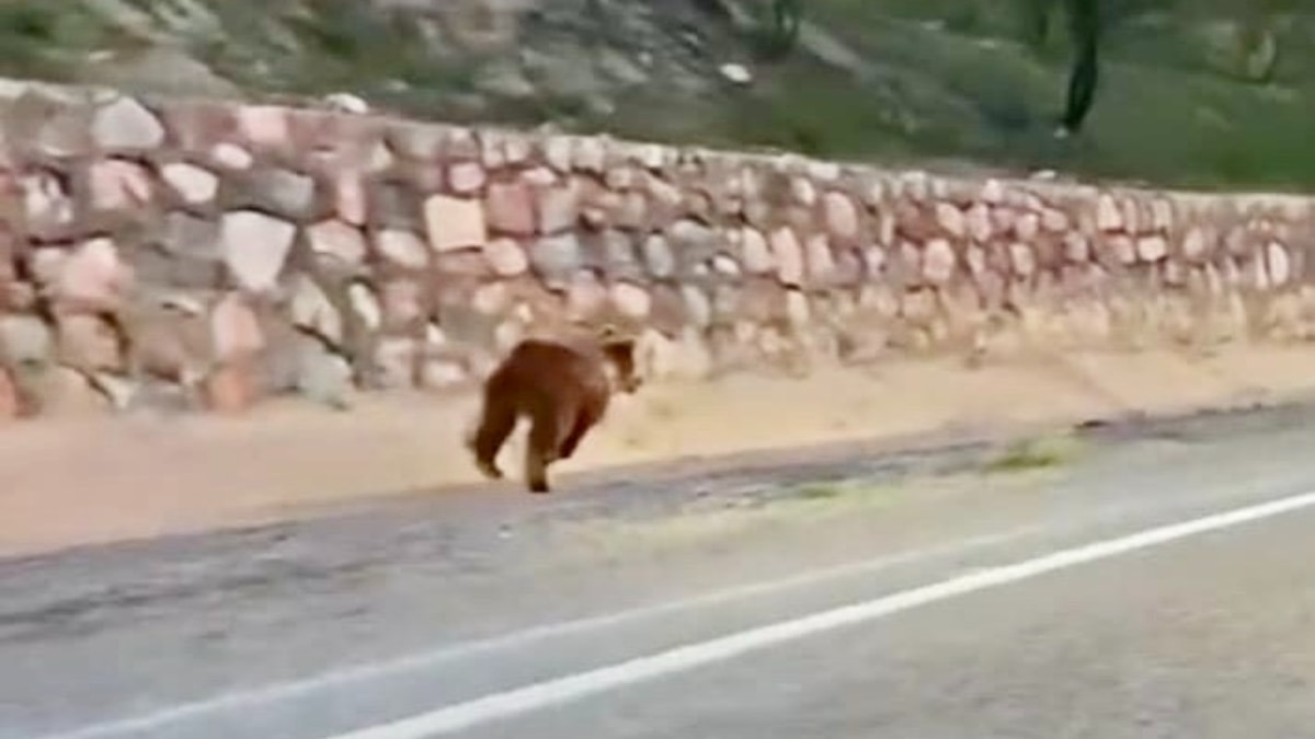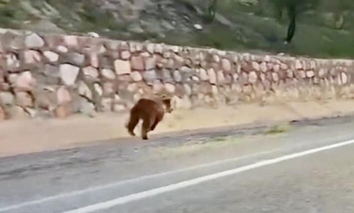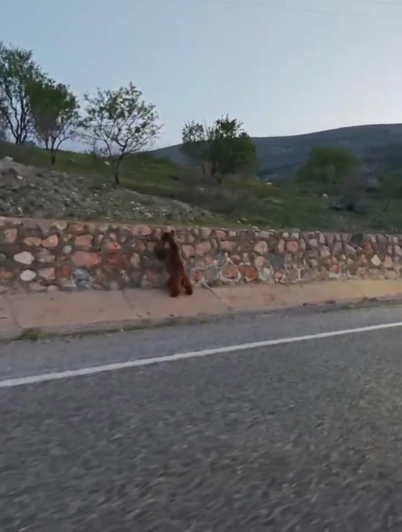 Yol kenarında bir süre ilerleyen ayı, ardından istinat duvarını aşarak gözden kayboldu.