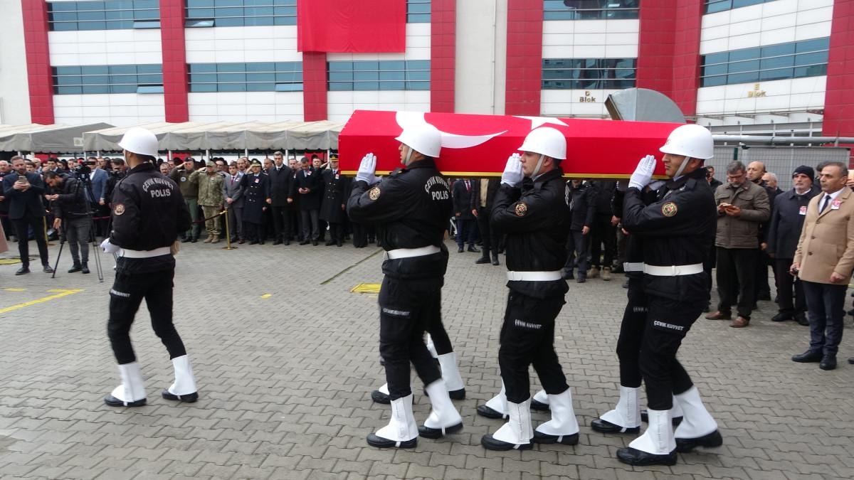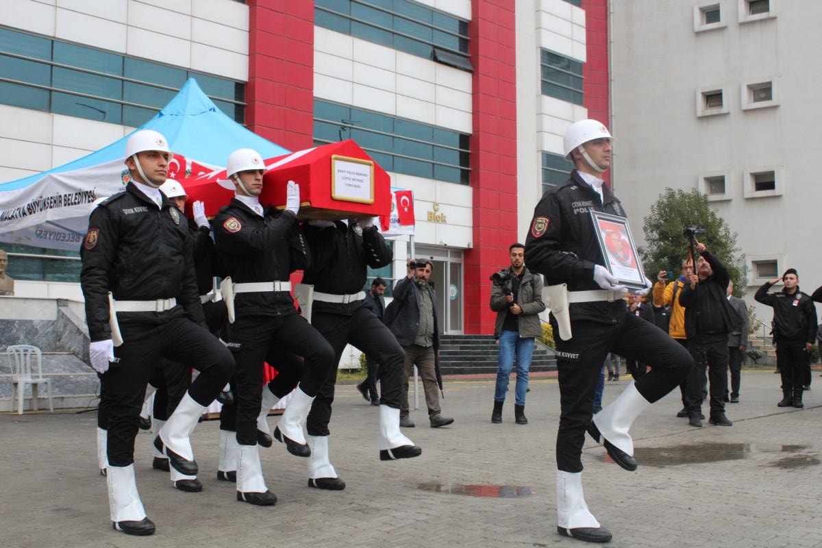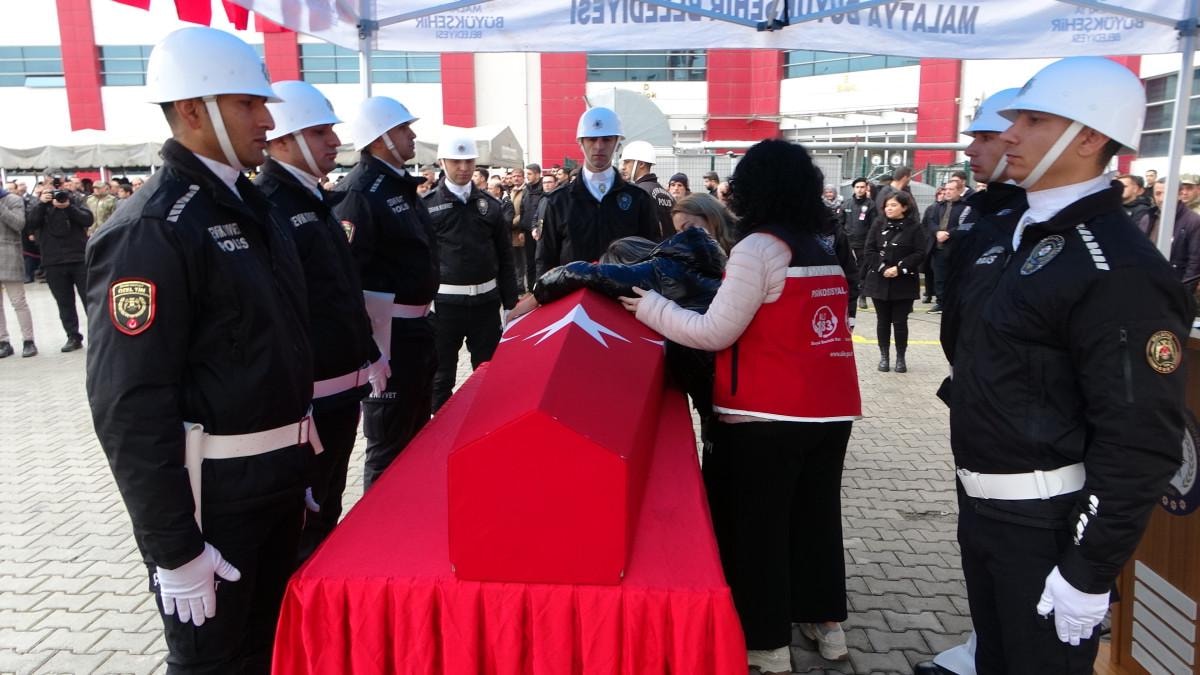 Şehit polisin Türk bayrağına sarılı naaşı, Malatya Şehir Mezarlığı'ndaki işlemlerinin ardından İl Emniyet Müdürlüğü bahçesine getirilerek katafalka konuldu.