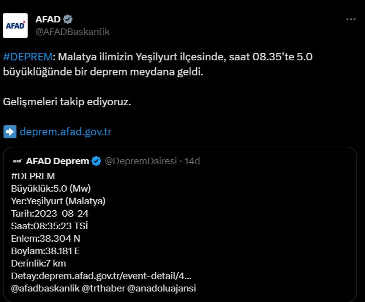 Afet ve Acil Durum Yönetimi Başkanlığı'ndan (AFAD), edinilen bilgiye göre Malatya'nın Yeşilyurt ilçesinde saat 08.35'te 5 büyüklüğünde deprem meydana geldi.